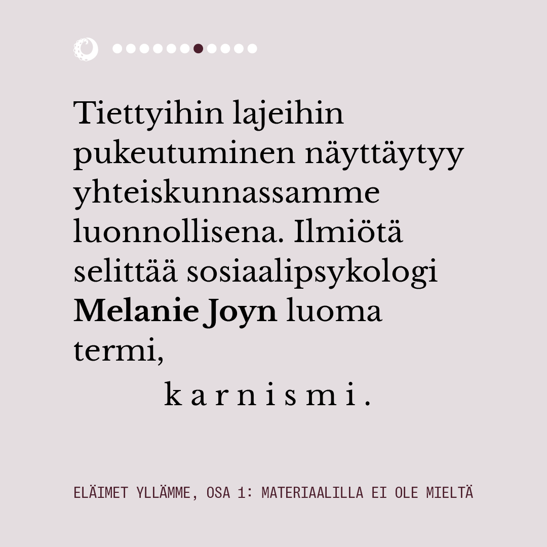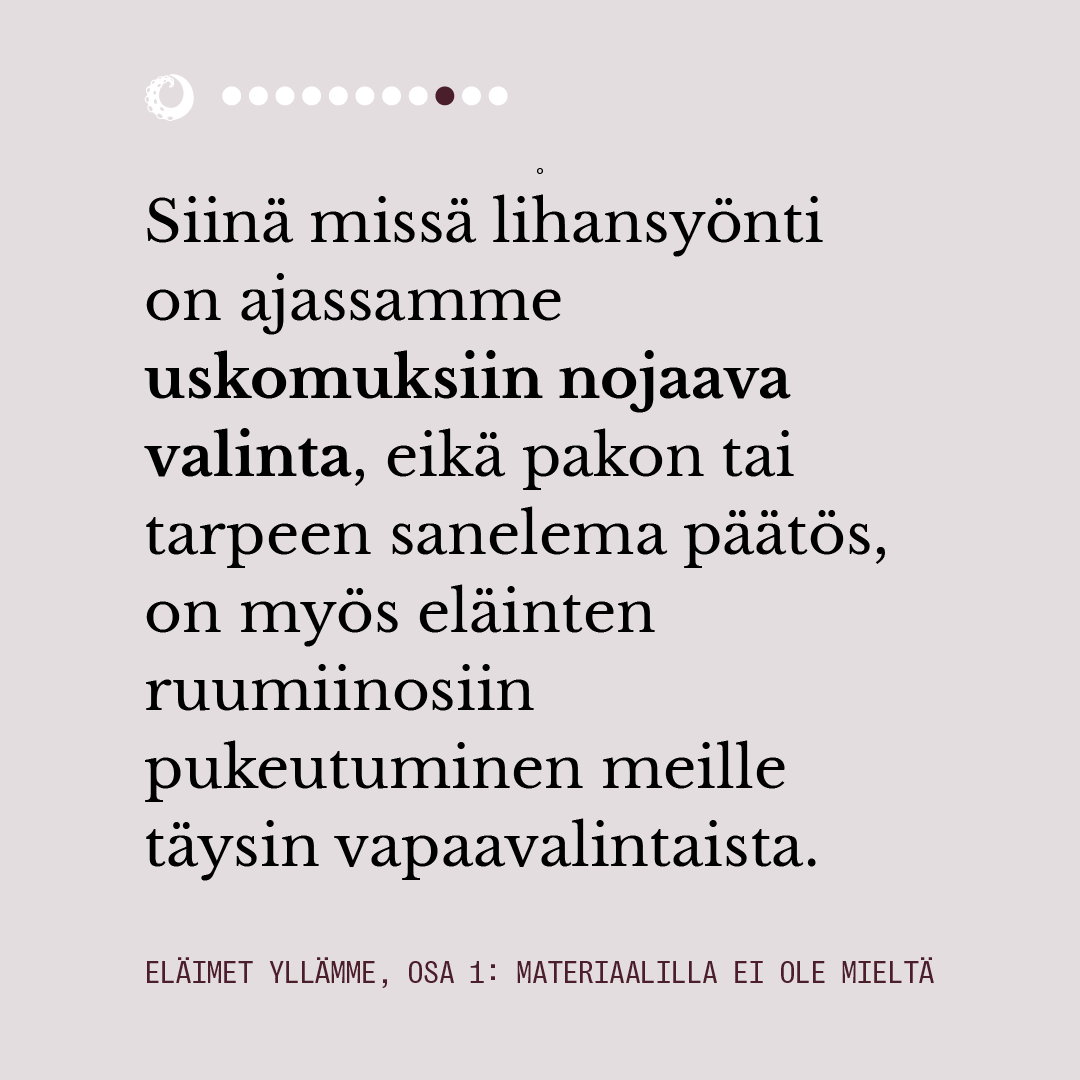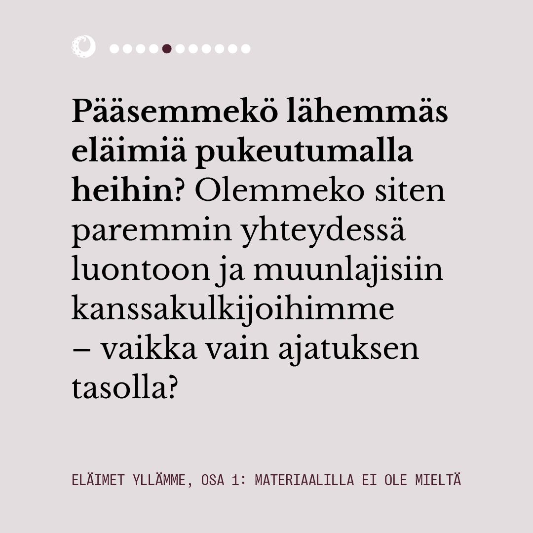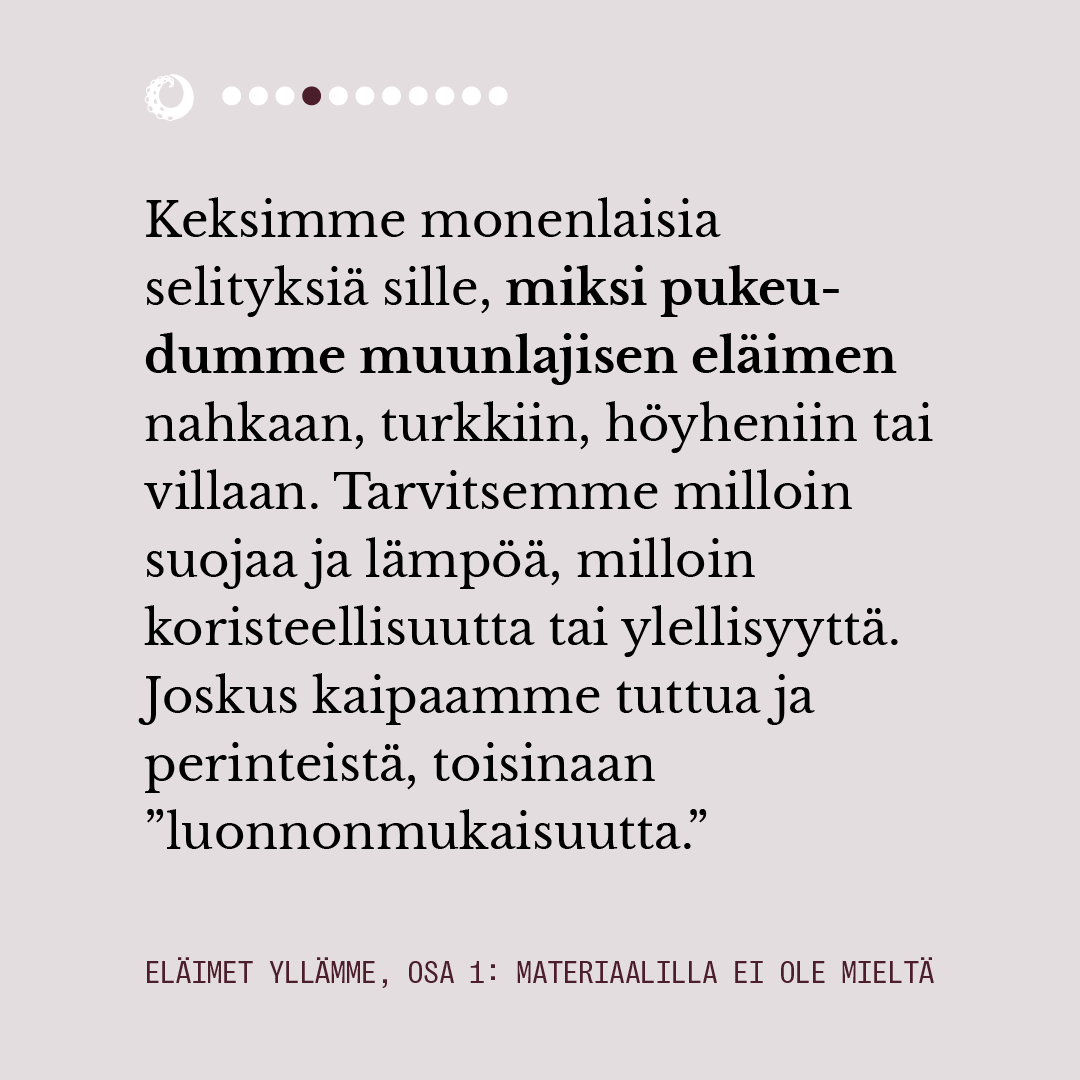 Ensimmäisessä osassa pohdimme muun muassa sitä, miten eläimiin pukeutuminen näyttäytyy yhteiskunnassamme luonnollisena. Lue juttu kokonaisuudessaan alta kuvaruuduista.