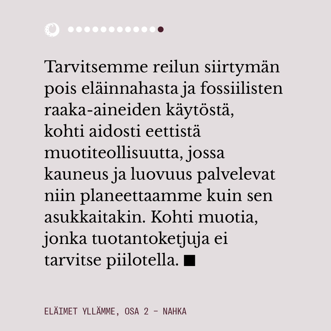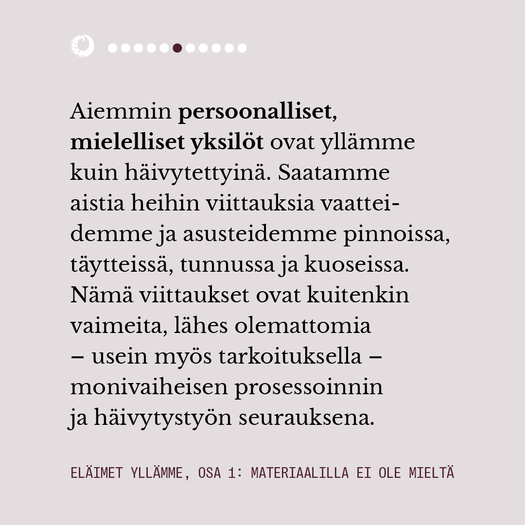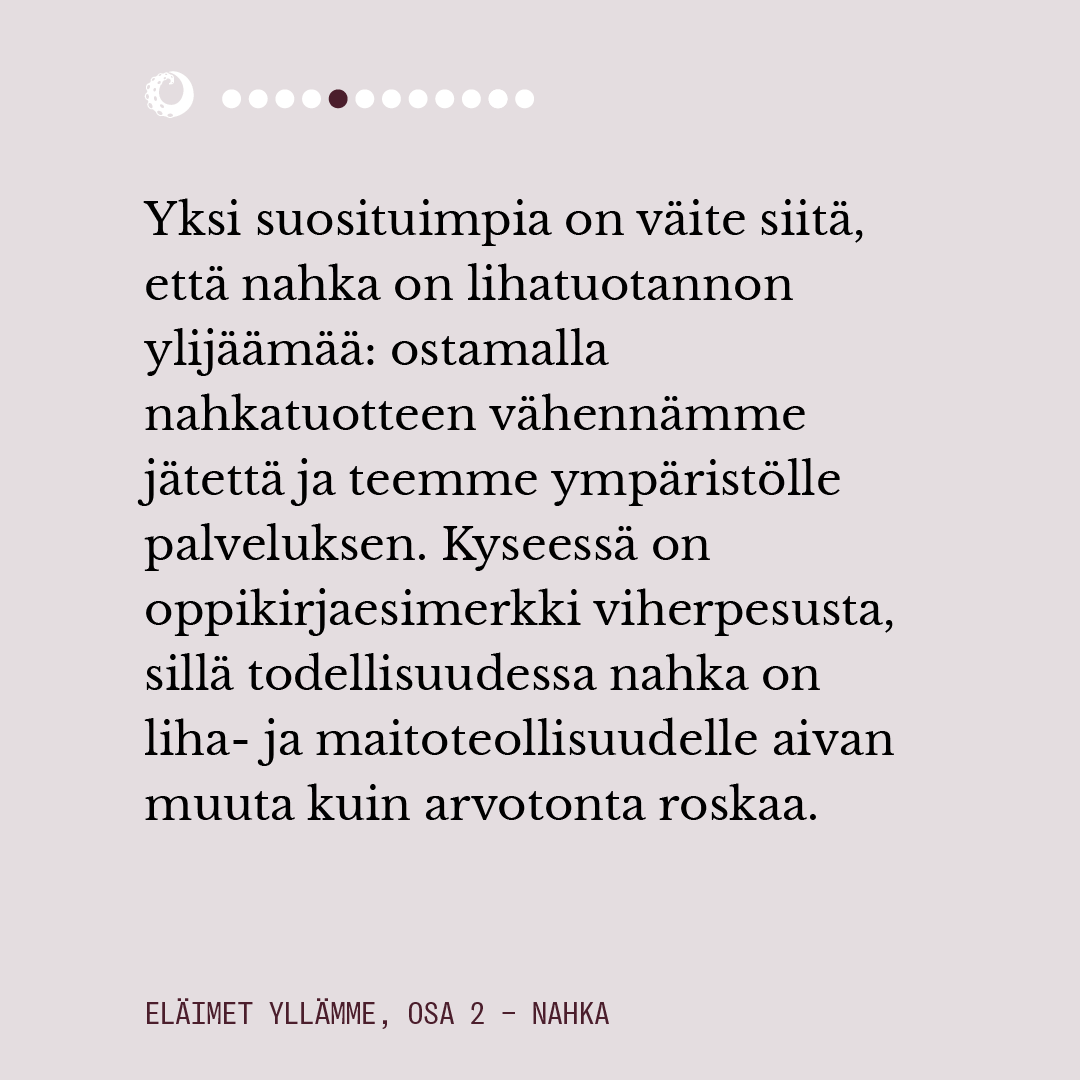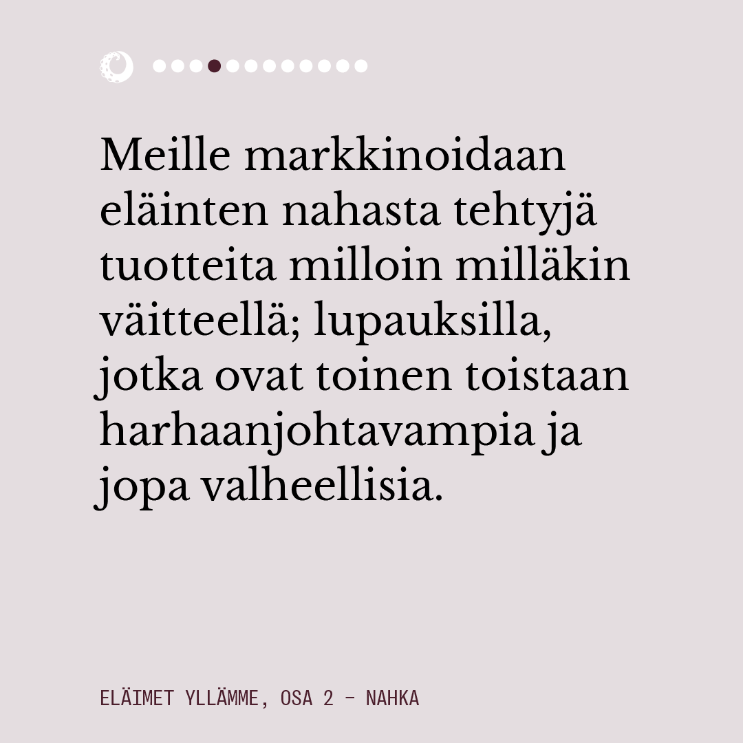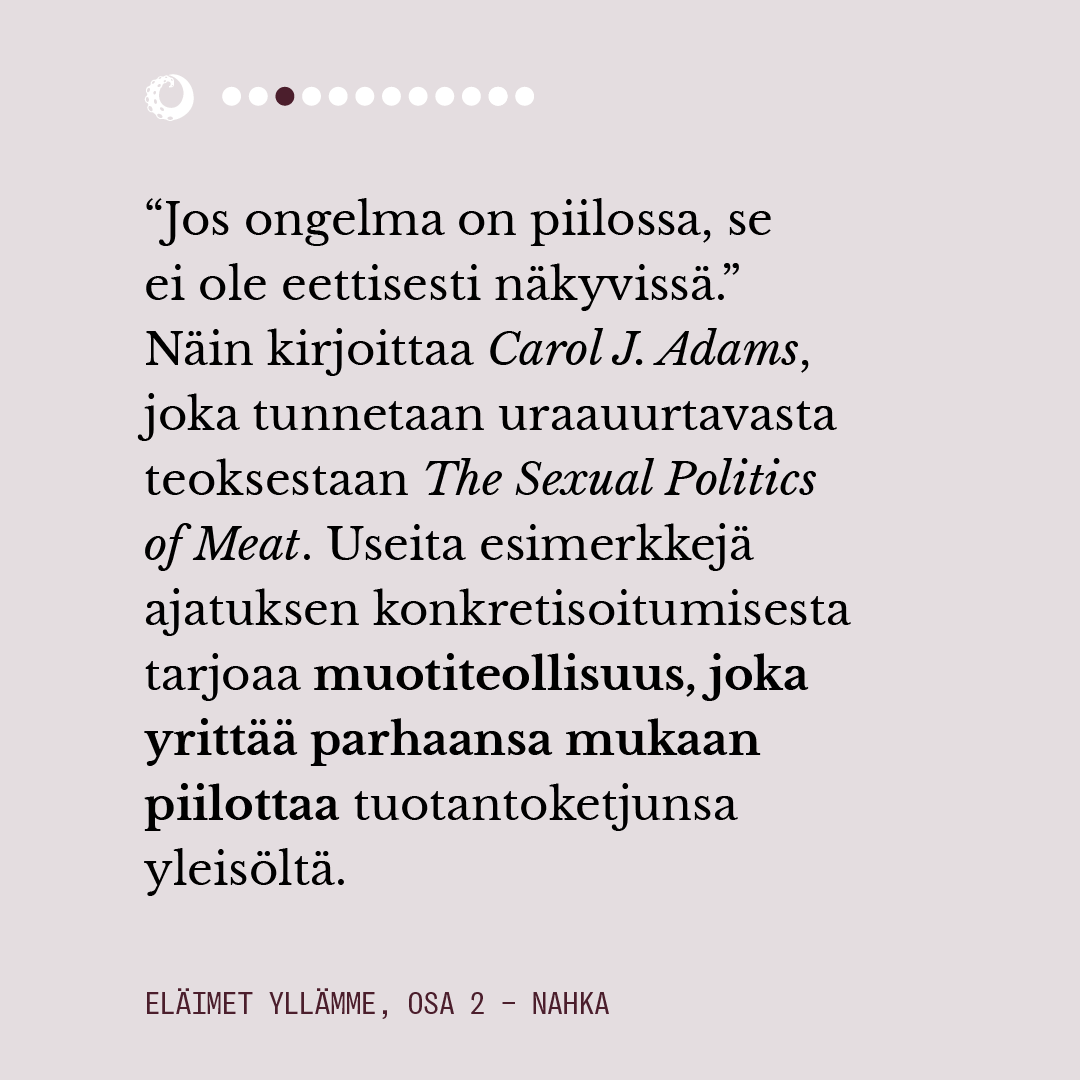 Ensimmäisessä osassa pohdimme muun muassa sitä, miten eläimiin pukeutuminen näyttäytyy yhteiskunnassamme luonnollisena. Lue juttu kokonaisuudessaan alta kuvaruuduista.