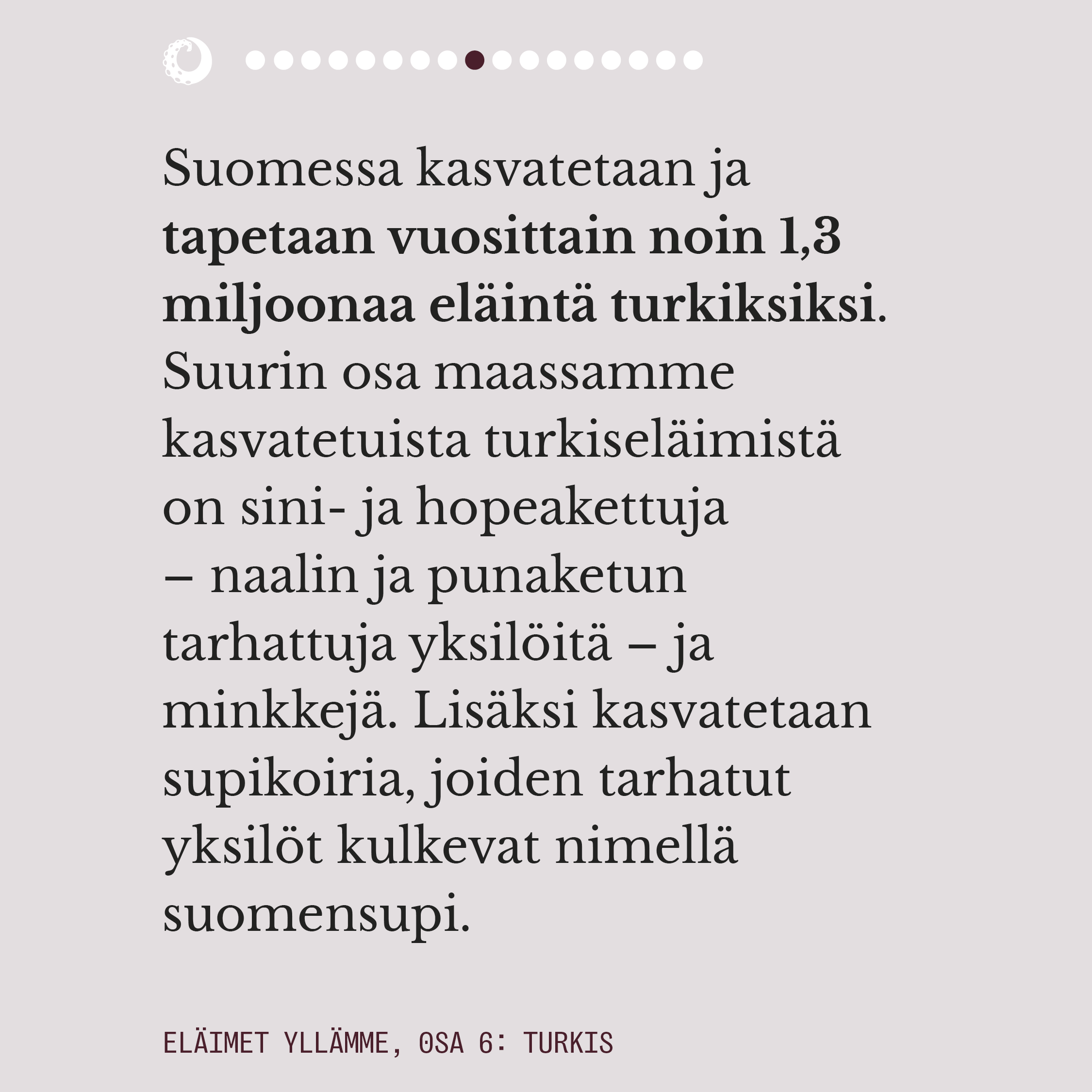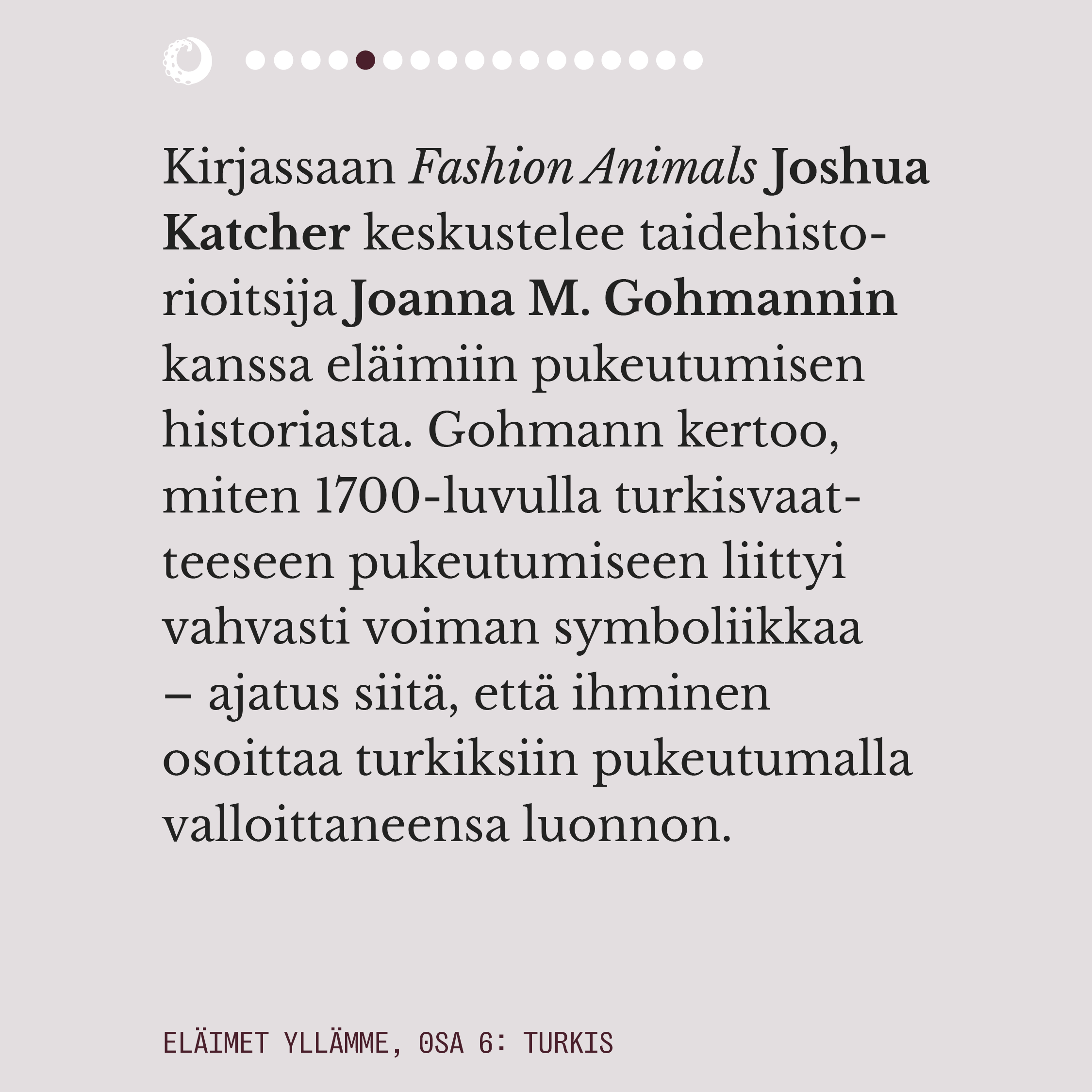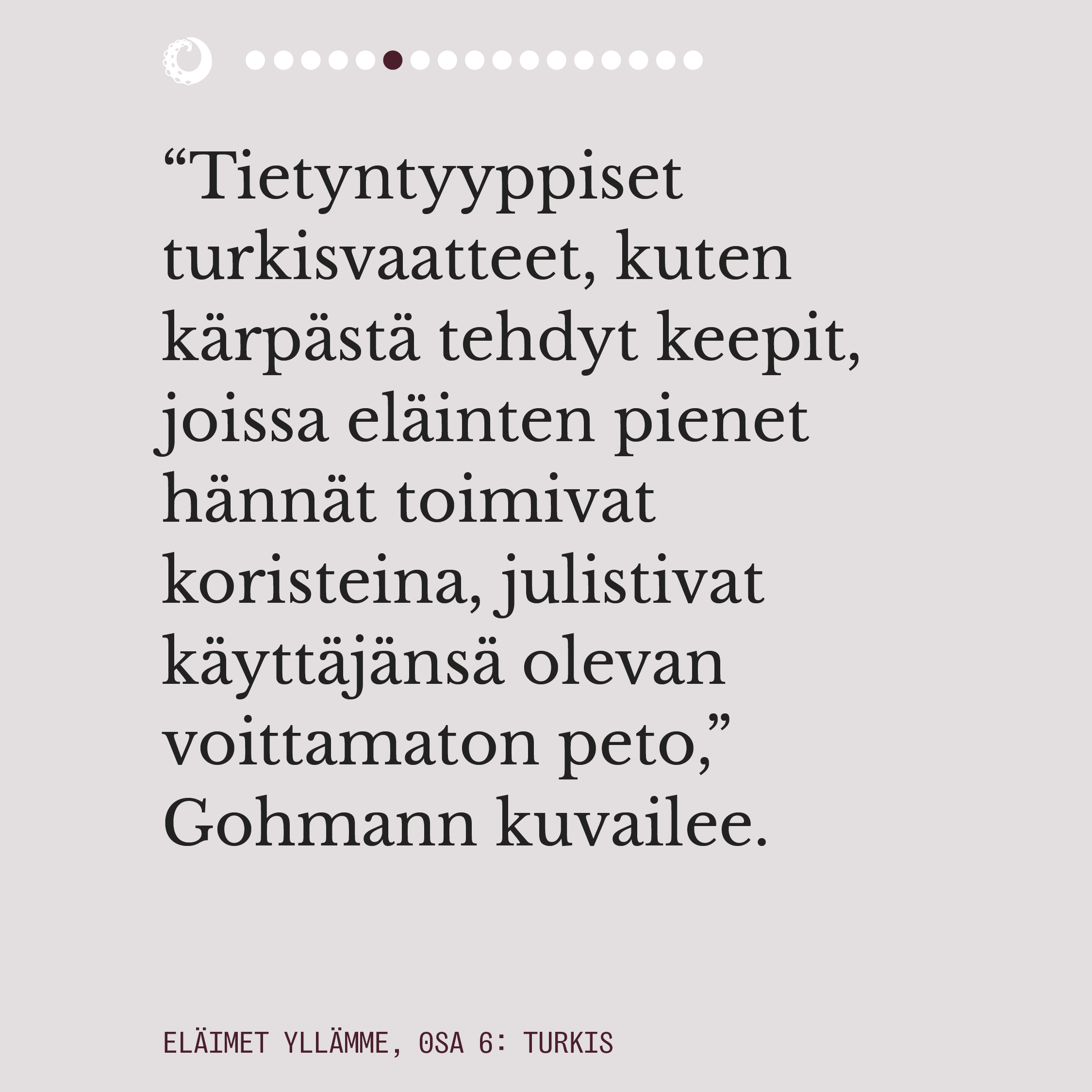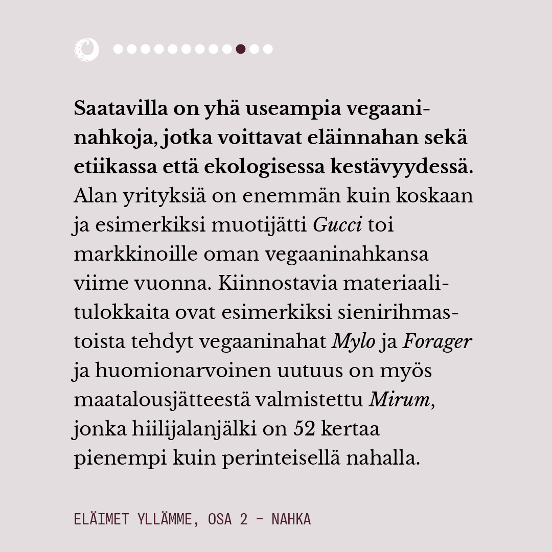 Ensimmäisessä osassa pohdimme muun muassa sitä, miten eläimiin pukeutuminen näyttäytyy yhteiskunnassamme luonnollisena. Lue juttu kokonaisuudessaan alta kuvaruuduista.