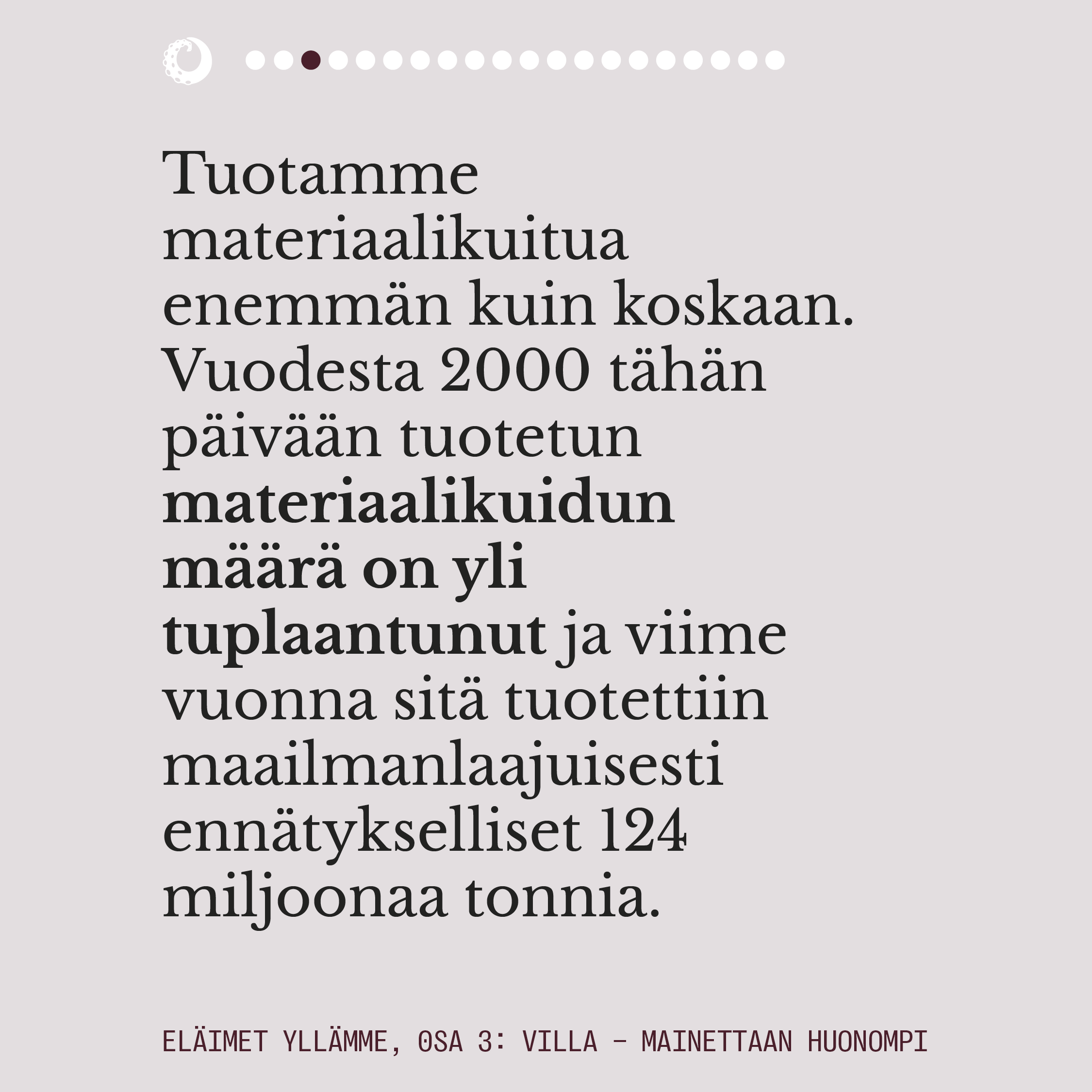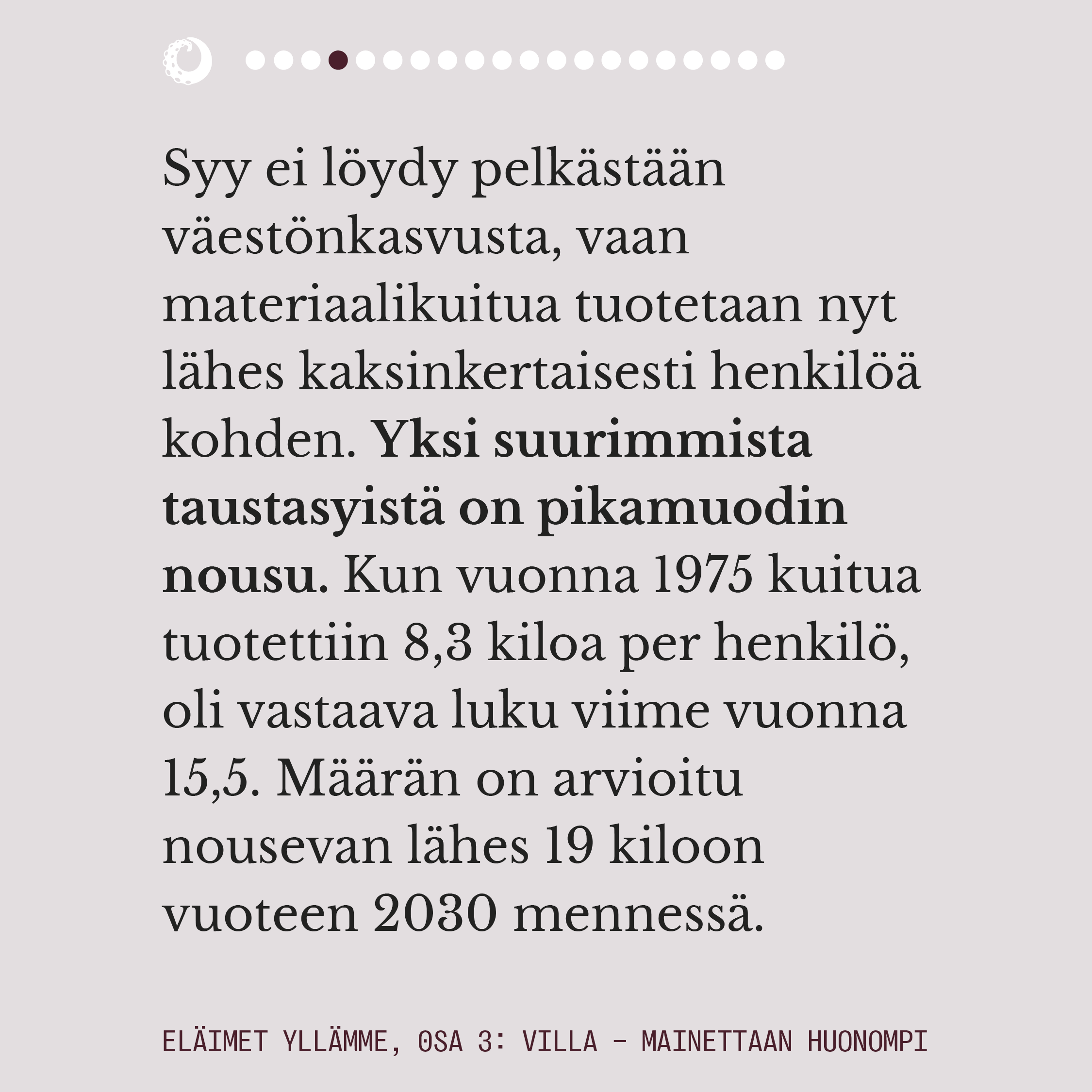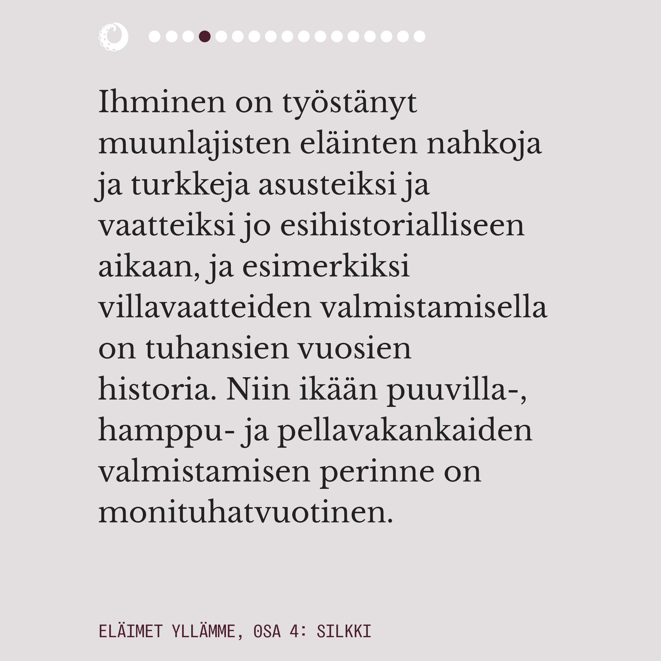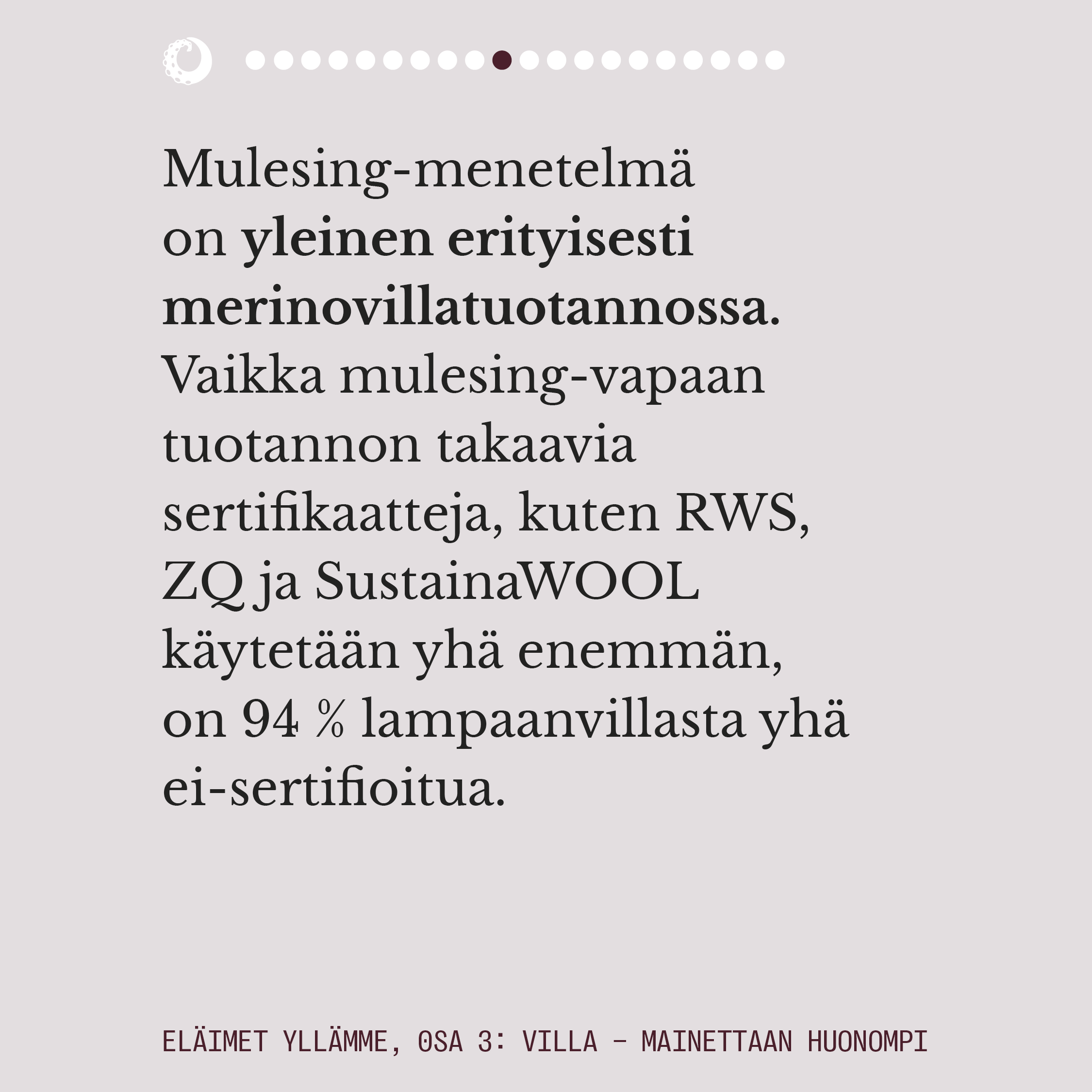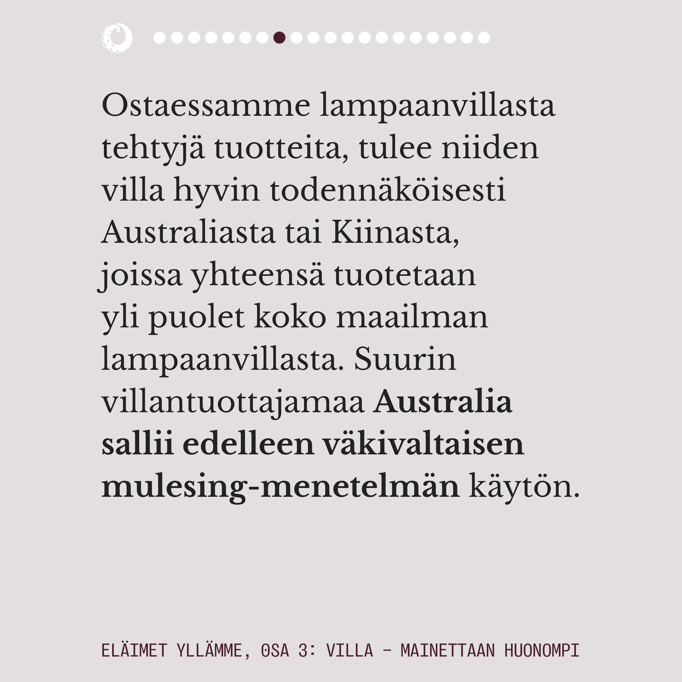 Sarjan 3. osa keskittyy usein ekologiseksi ja luonnonmukaiseksikin miellettyyn lampaanvillaan, joka on eläinperäisistä materiaalikuiduista eniten tuotettu.
