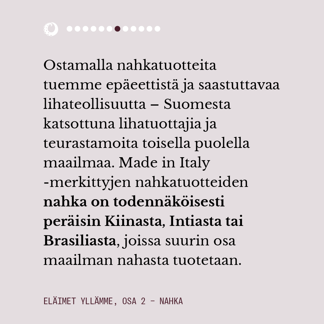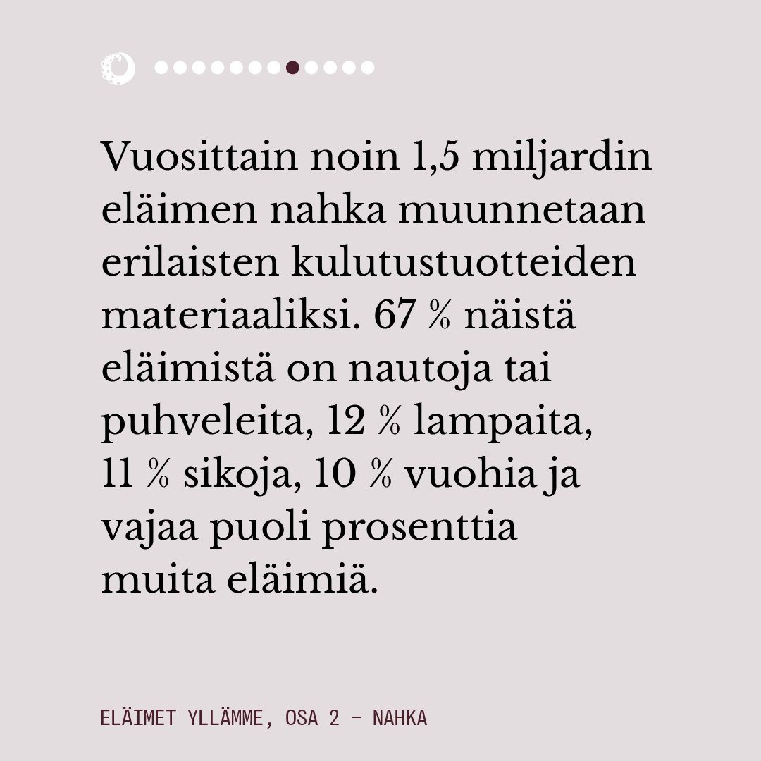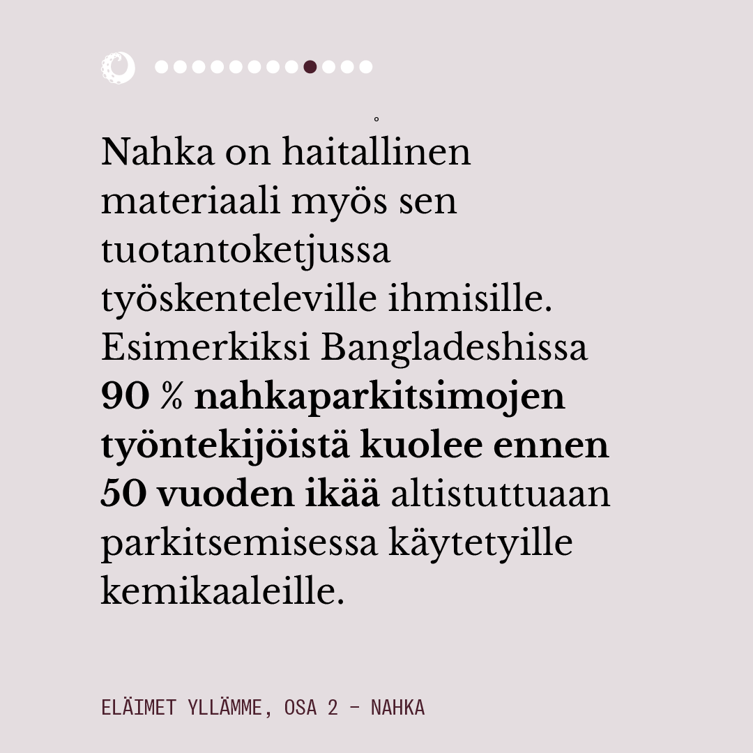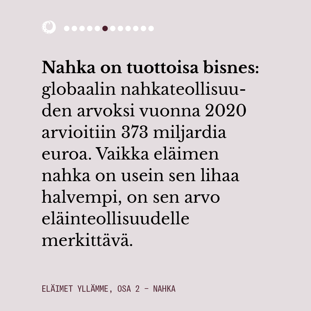 Vuosittain 1,5 miljardin eläimen nahka muunnetaan erilaisten kulutustuotteiden materiaaliksi. Nahan markkinointiin liittyy paljon viherpesua, ja ympäristöä raskaasti kuormittavan materiaalin tuotantoketjussa ei huomioida sen paremmin ihmisten kuin muunlajisten eläintenkään tarpeita.