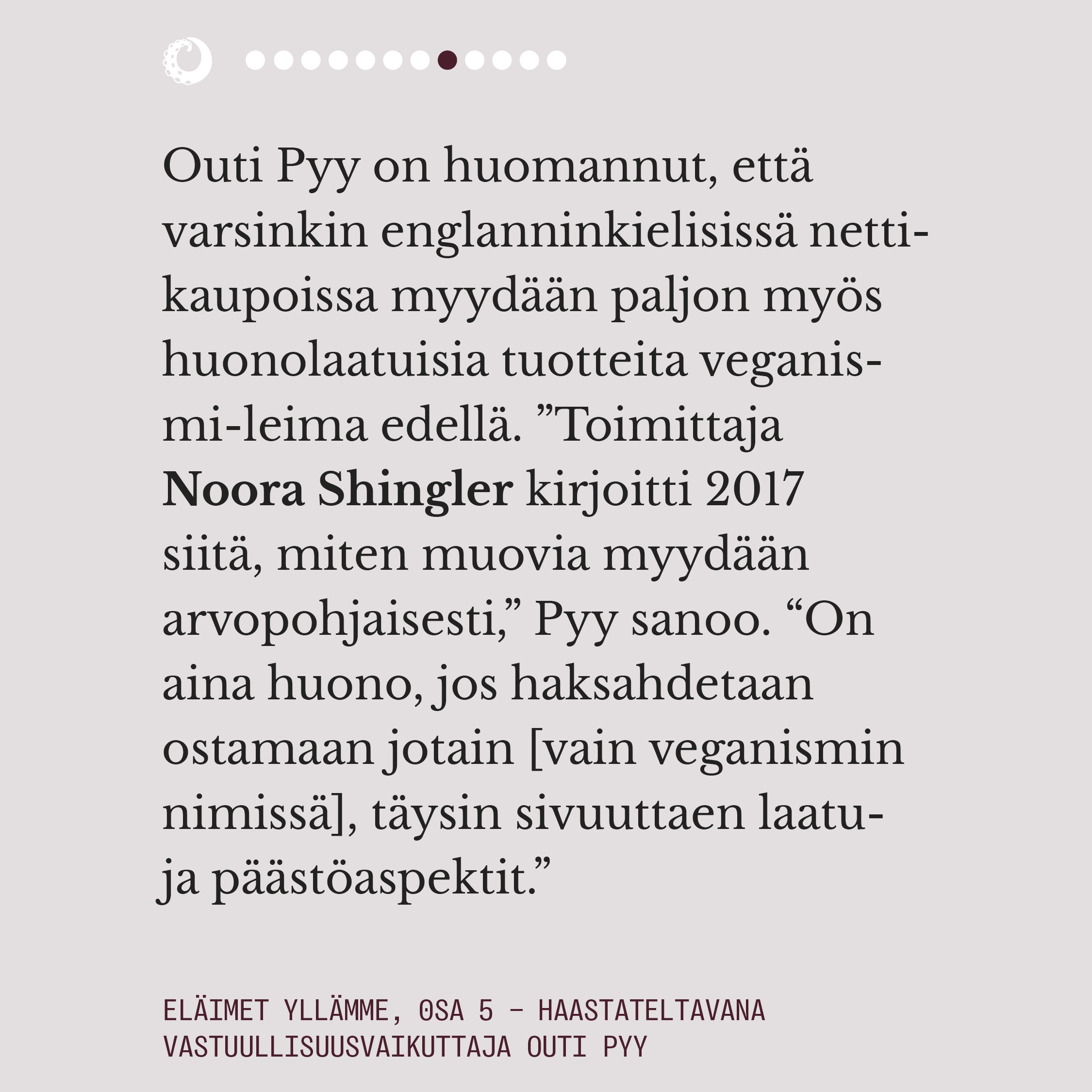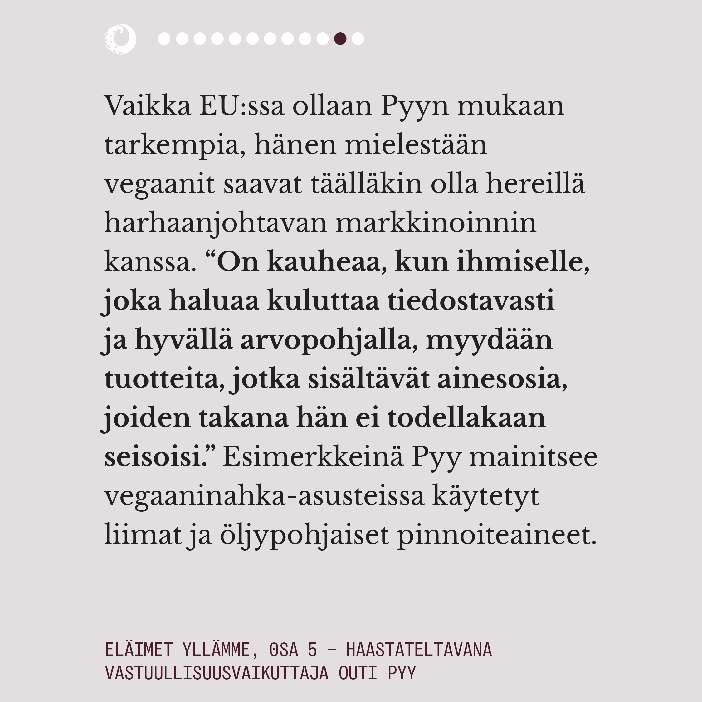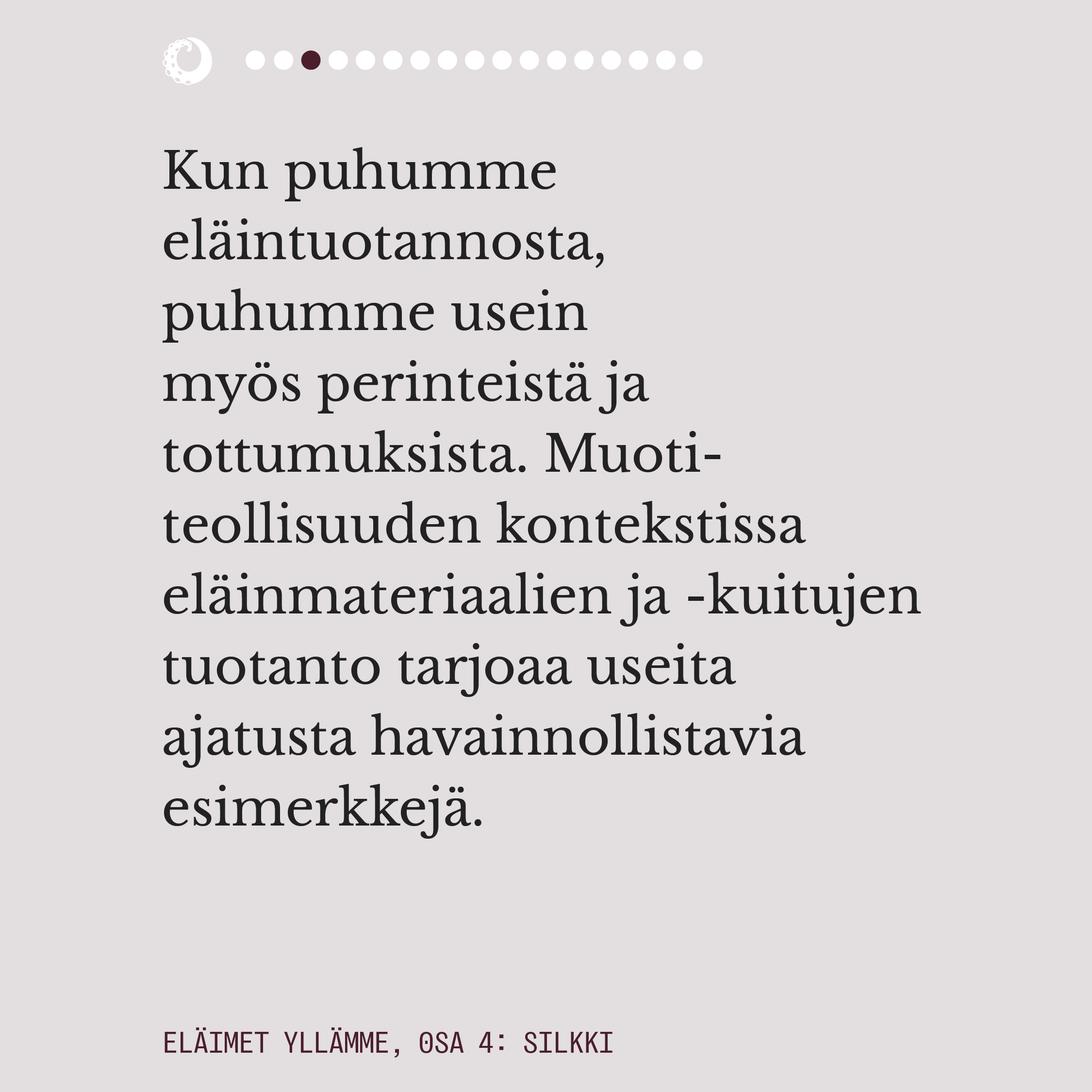 Eläimet yllämme -sarja avaa muodin eettisyyttä ja ympäristökuormaa käytetyimpien eläinkuitujen ja -materiaalien tuotannossa. Esitämme kysymyksiä, käymme keskustelua muotialan asiantuntijoiden ja ammattilaisten kanssa, ja tarjoamme toiveikkuutta vegaanisten ja kestävien vaihtoehtojen muodossa.
