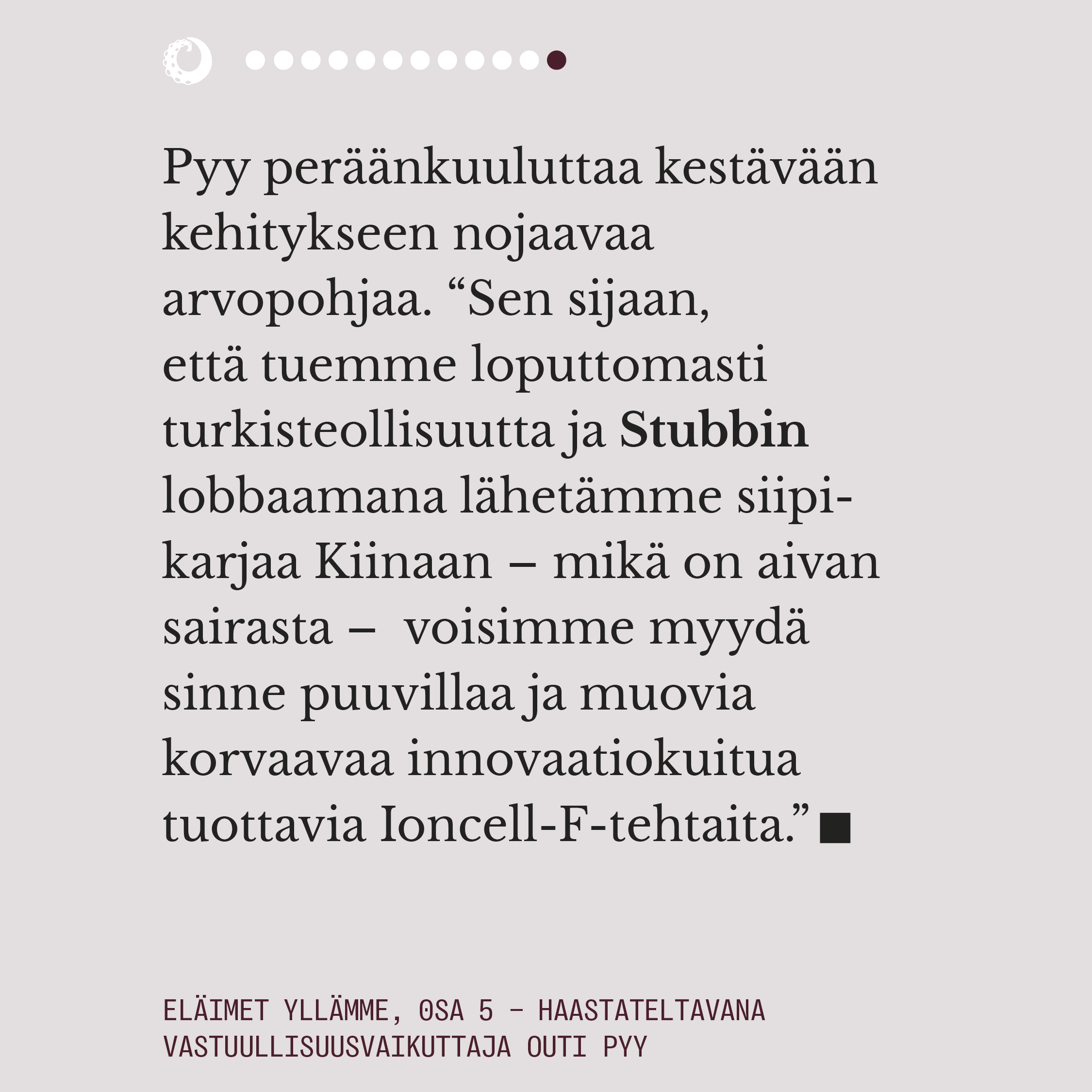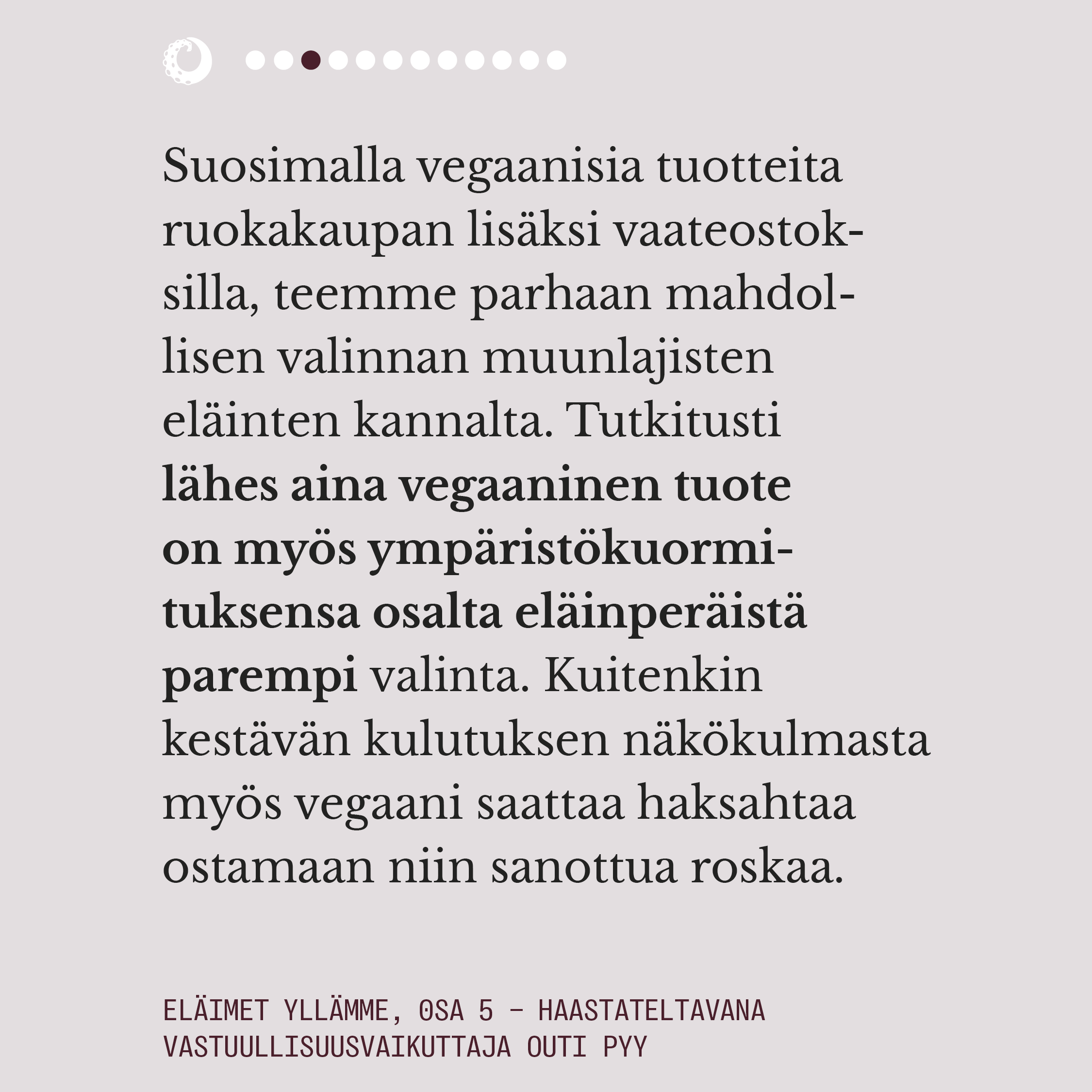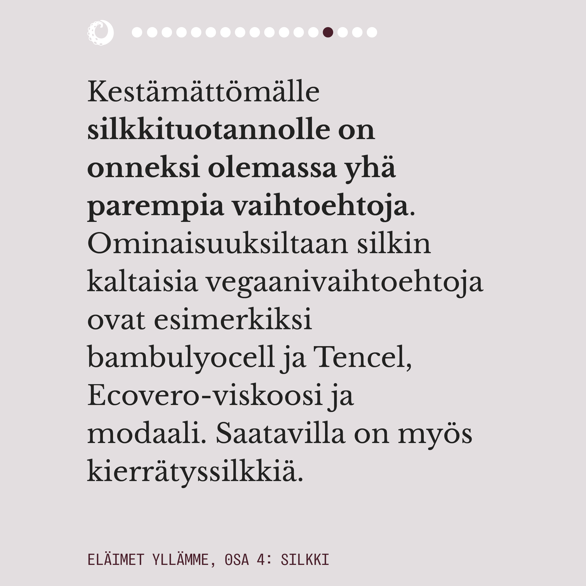 Eläimet yllämme -sarja avaa muodin eettisyyttä ja ympäristökuormaa käytetyimpien eläinkuitujen ja -materiaalien tuotannossa. Esitämme kysymyksiä, käymme keskustelua muotialan asiantuntijoiden ja ammattilaisten kanssa, ja tarjoamme toiveikkuutta vegaanisten ja kestävien vaihtoehtojen muodossa.