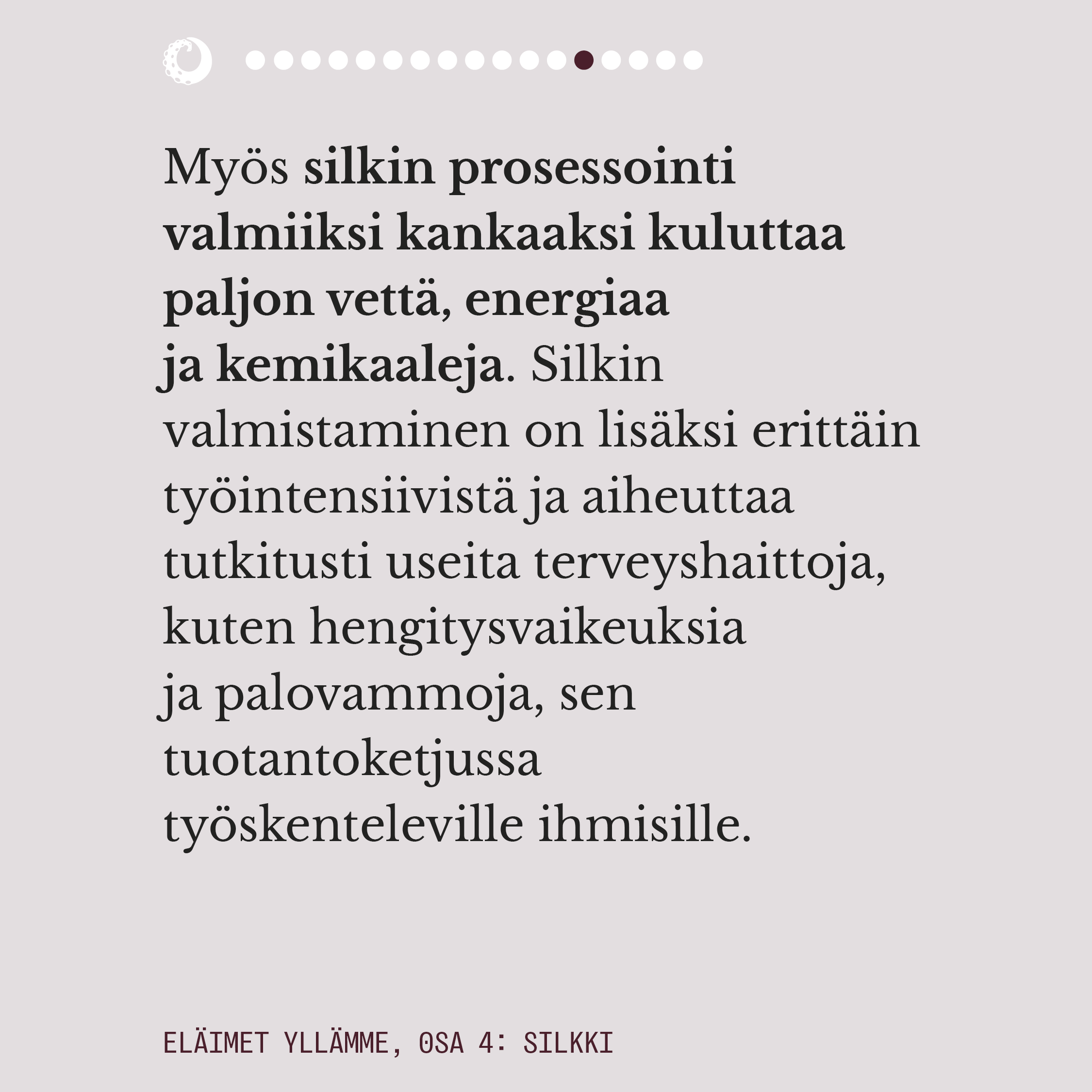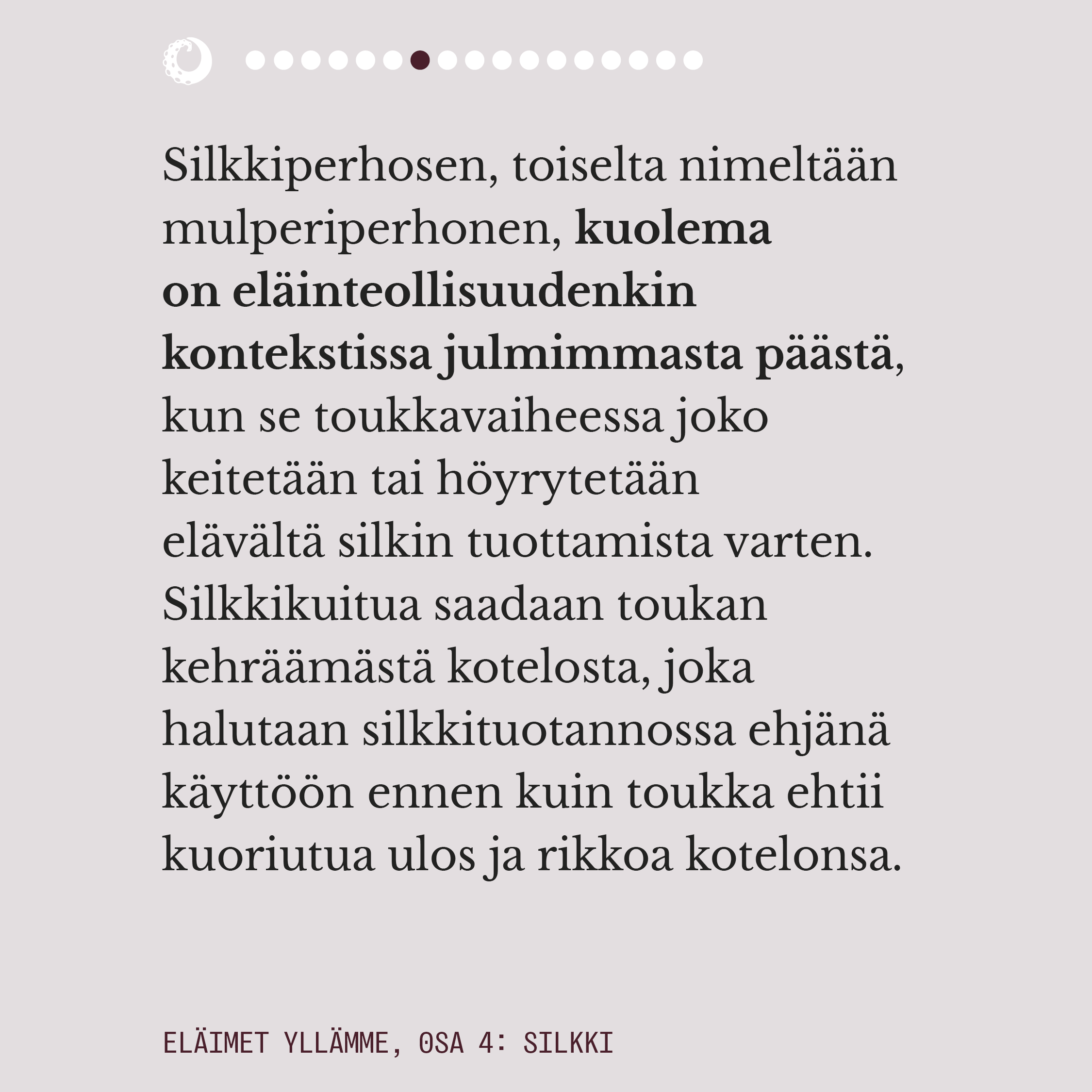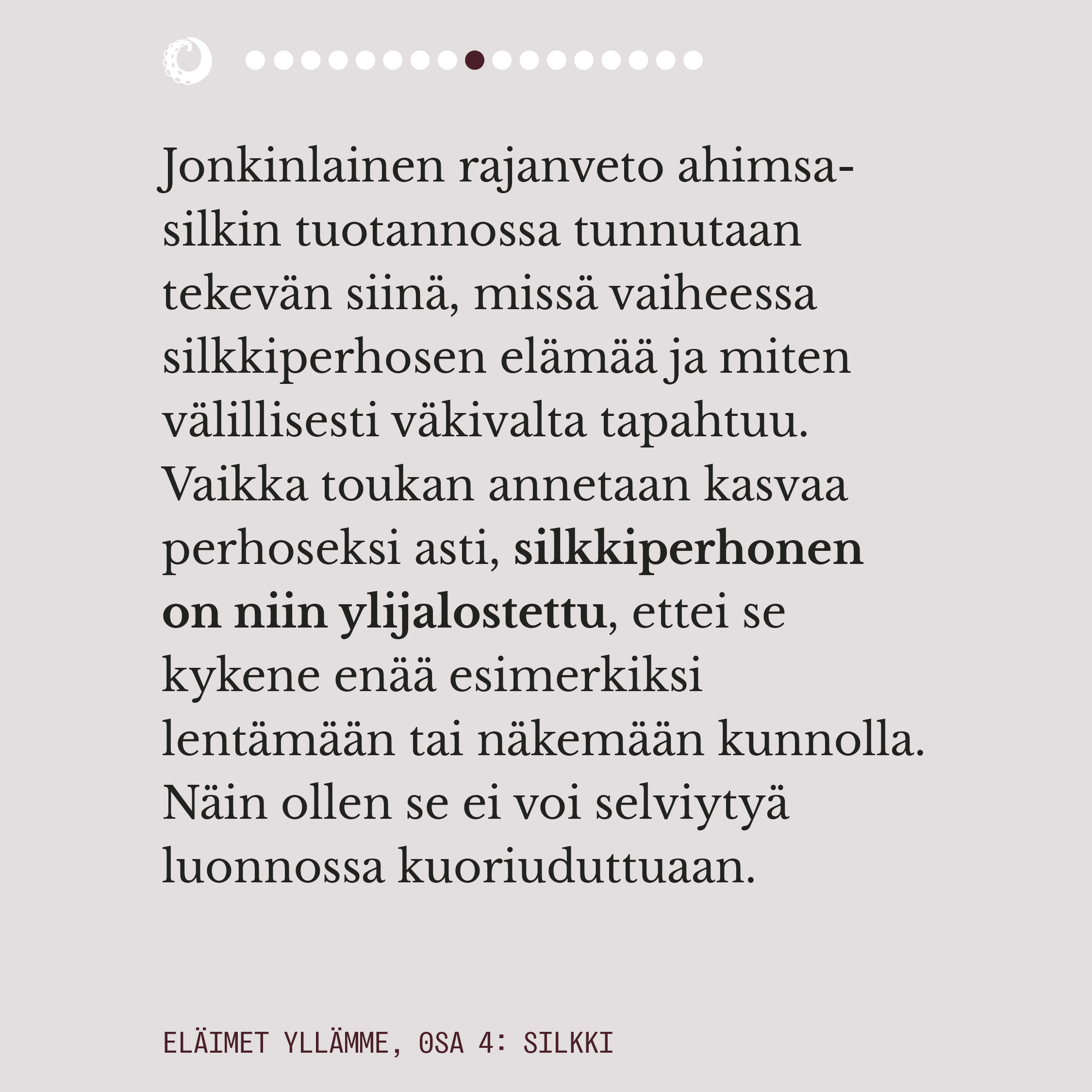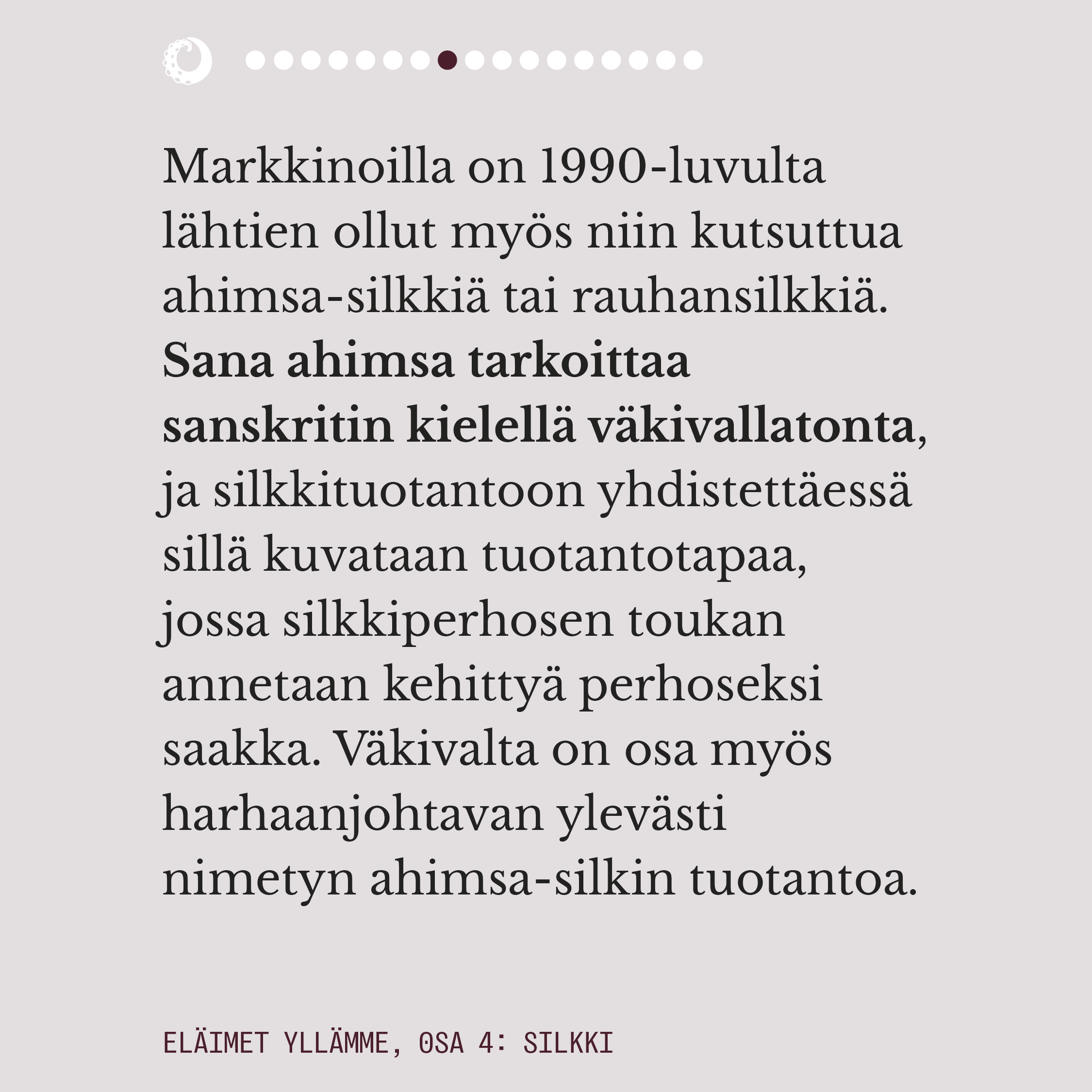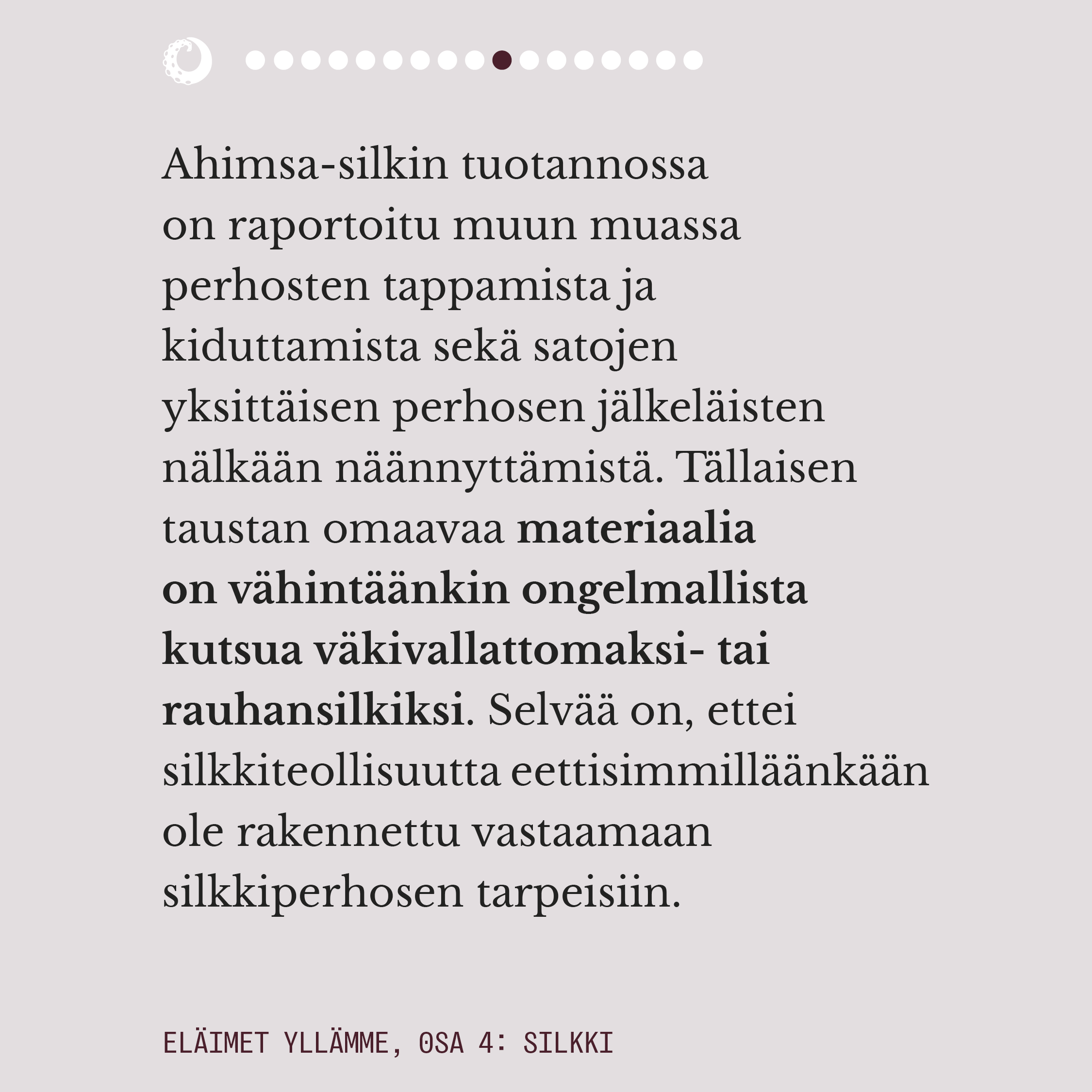 Ylelliseksikin mielletyn silkin valmistuksella on pitkä historia. Välkehtivän pinnan alla oleva todellisuus on kaikkea muuta kuin loistokas ja silkkiperhoselle aiheutettu kuolema on eläinteollisuudenkin konteksissa julmimmasta päästä. Rauhansilkkinä tunnettu ahimsa-silkki ei ole vaihtoehtona juuri tavallista silkkiä parempi, mutta onneksi myös aidosti väkivallattomia vaihtoehtoja silkille on olemassa.