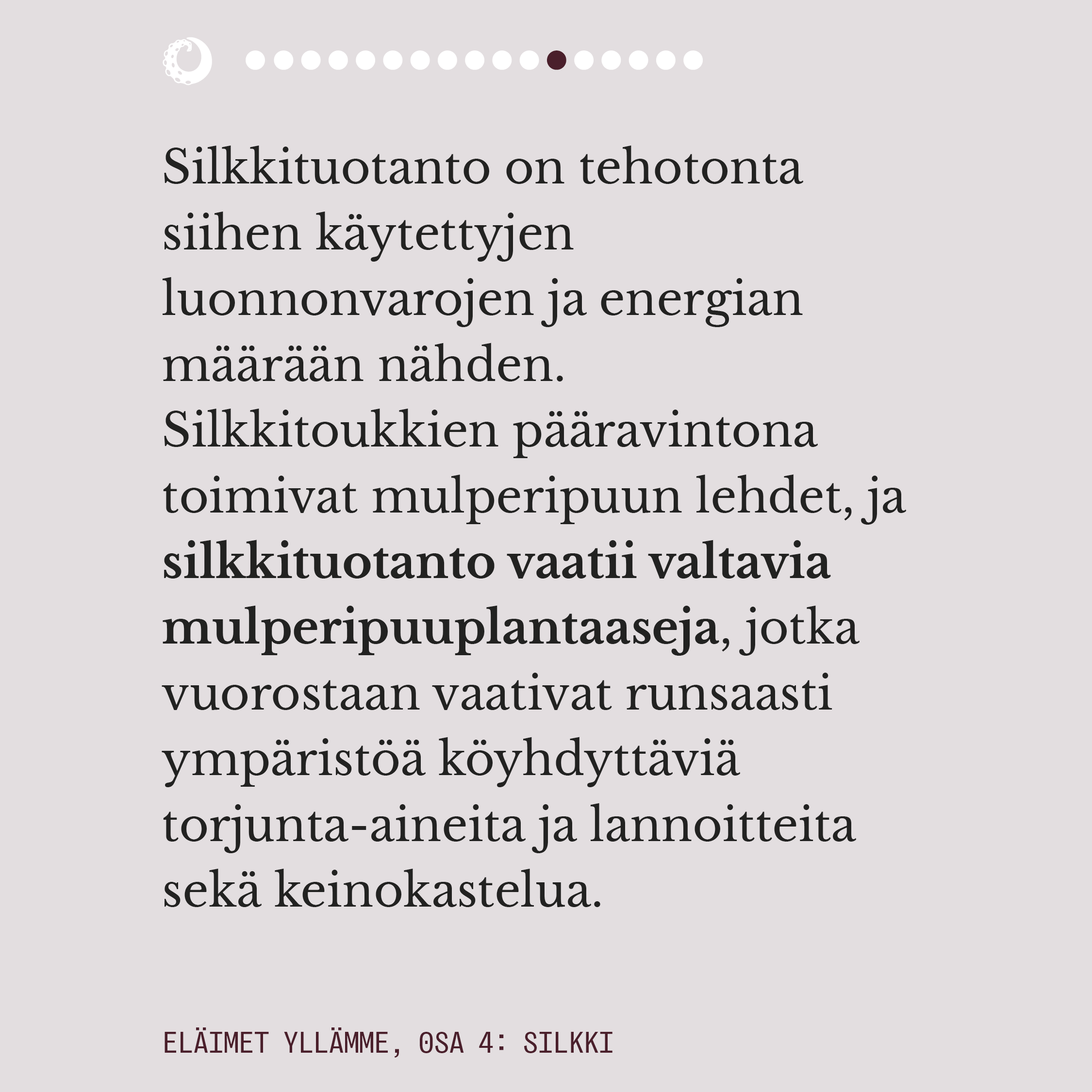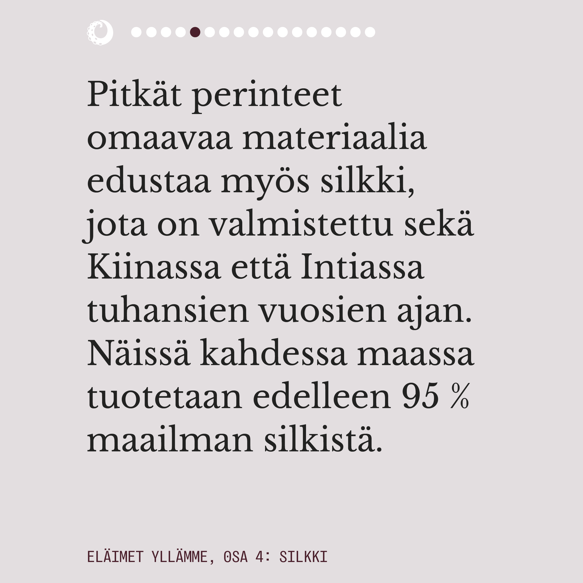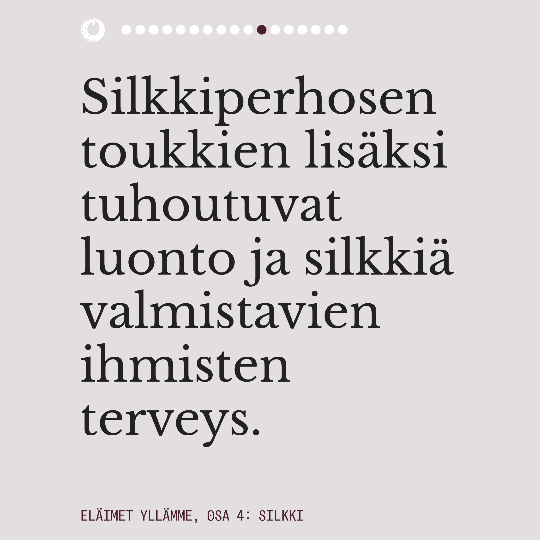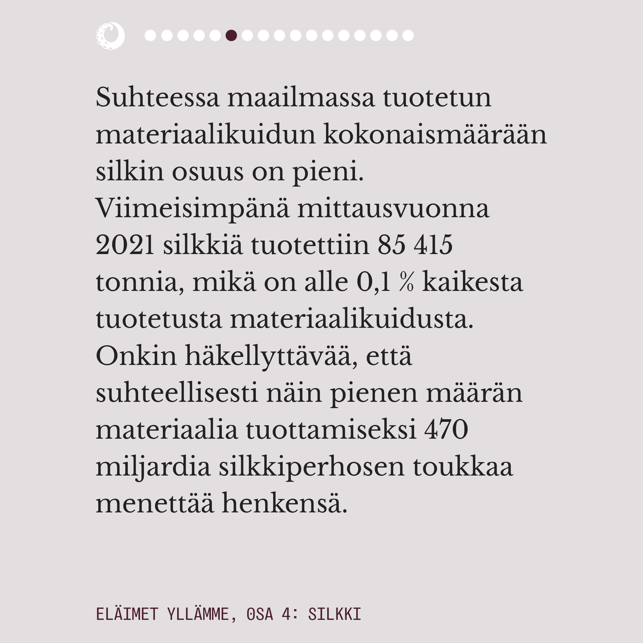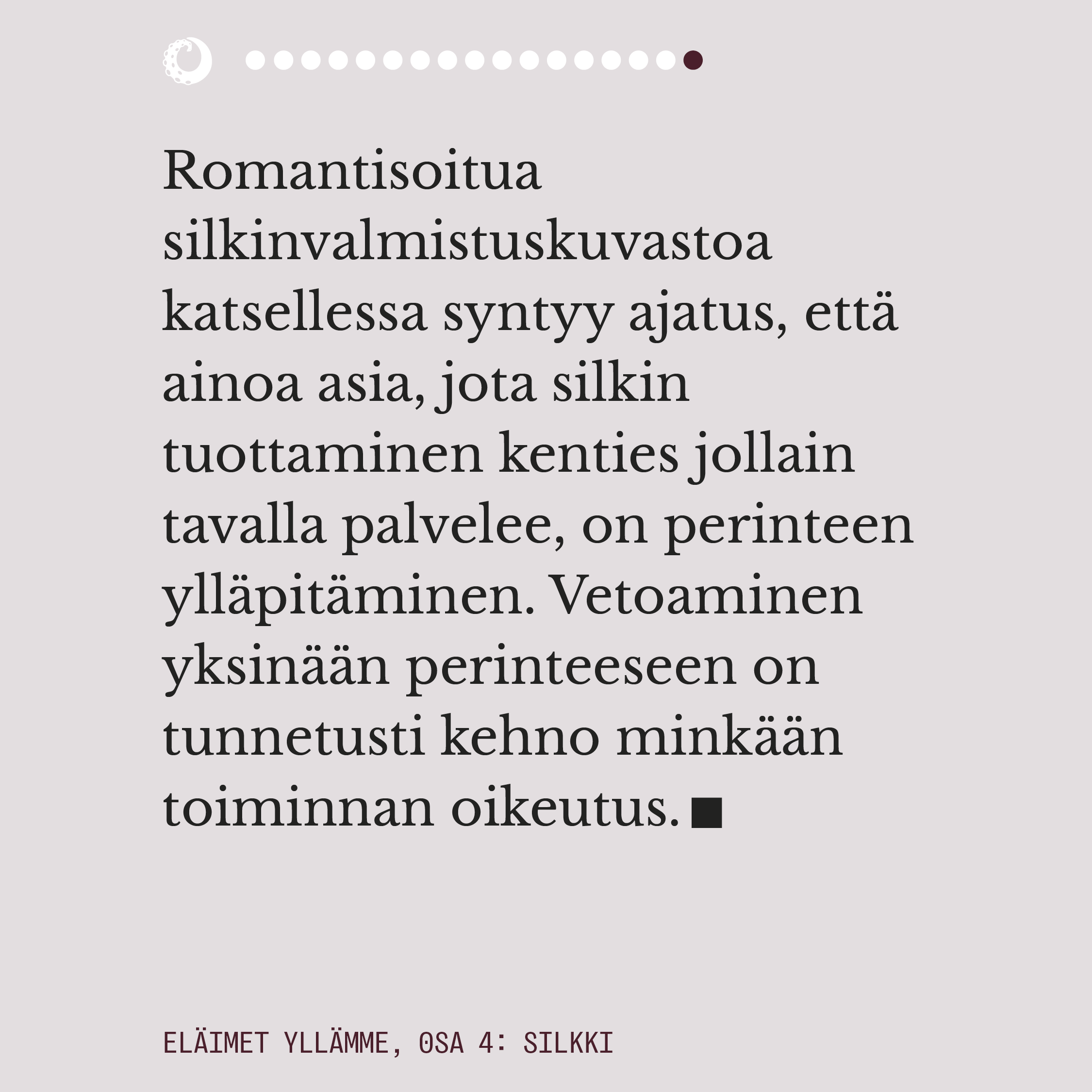 Ylelliseksikin mielletyn silkin valmistuksella on pitkä historia. Välkehtivän pinnan alla oleva todellisuus on kaikkea muuta kuin loistokas ja silkkiperhoselle aiheutettu kuolema on eläinteollisuudenkin konteksissa julmimmasta päästä. Rauhansilkkinä tunnettu ahimsa-silkki ei ole vaihtoehtona juuri tavallista silkkiä parempi, mutta onneksi myös aidosti väkivallattomia vaihtoehtoja silkille on olemassa.