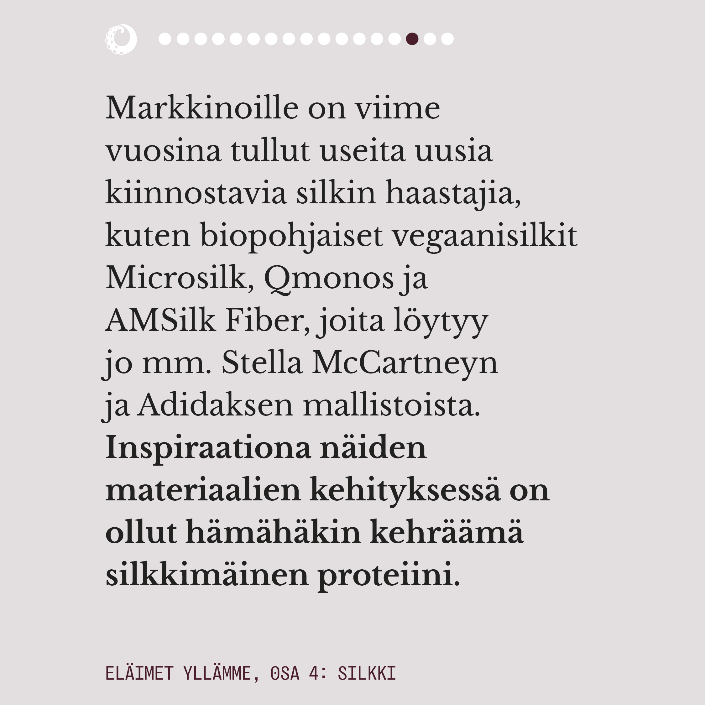 Sarjan viimeisessä osiossa suuntaamme katseen uusiin materiaaleihin ja materiaalikehityksen nykykenttään. Ihmispopulaation kasvaessa suuren yleisön saataville on tärkeää kehittää materiaalivaihtoehtoja, joita voidaan tuottaa ympäristön kannalta kestävästi myös isoja määriä. Tällaisia eivät sen paremmin ole fossiilipohjaiset kuidut kuin mitkään eläinperäisistä materiaaleistakaan.