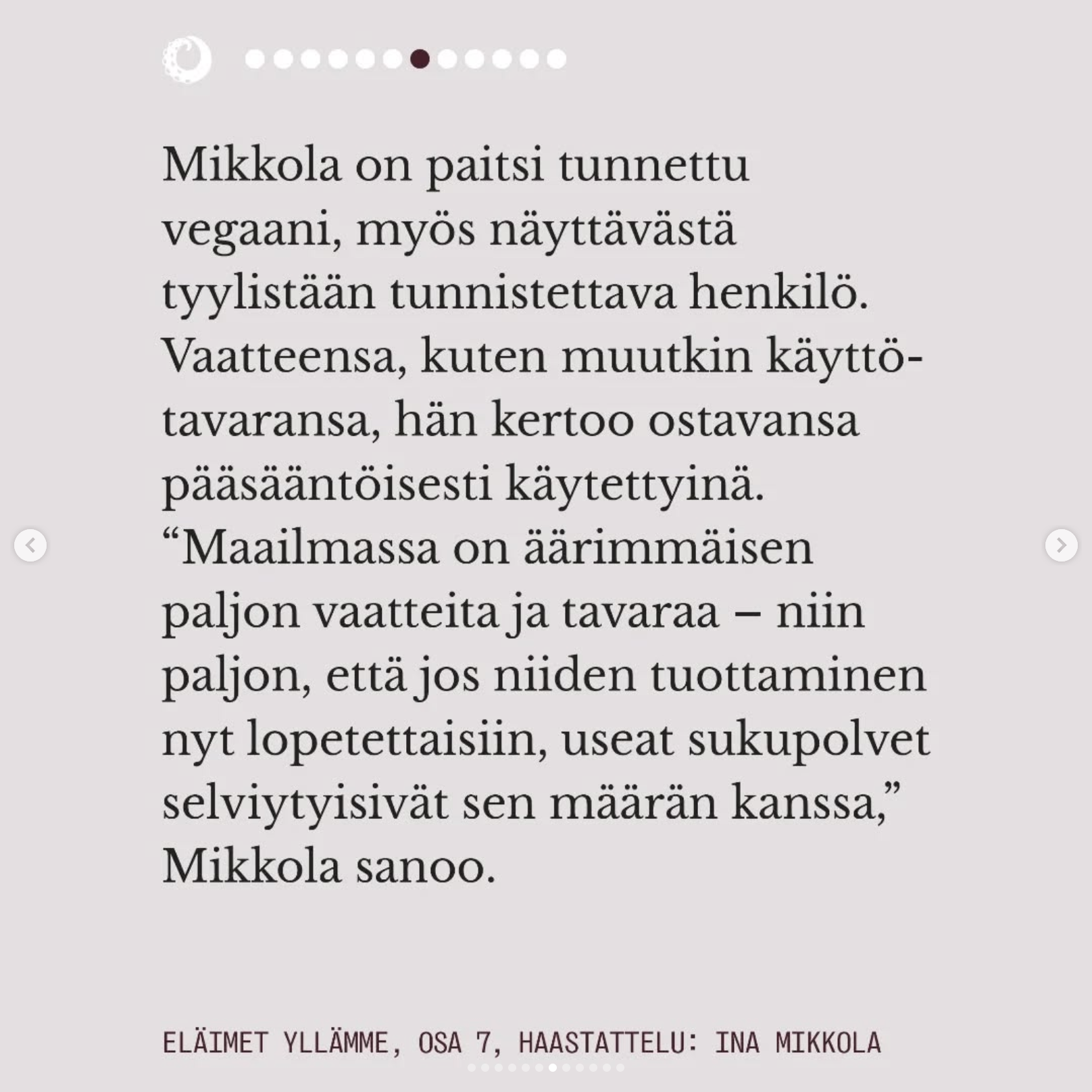Toimittaja, ohjaaja ja kirjailija Ina Mikkola on tunnettu paitsi veganismin puolestapuhujana, myös näyttävästä ja tunnistettavasta tyylistään. Veganismi on Mikkolalle perustavanlaatuinen ja luonnollinen osa identiteettiä. Vaatteensa, kuten muutkin käyttötavaransa, Mikkola kertoo ostavansa pääsääntöisesti käytettyinä.