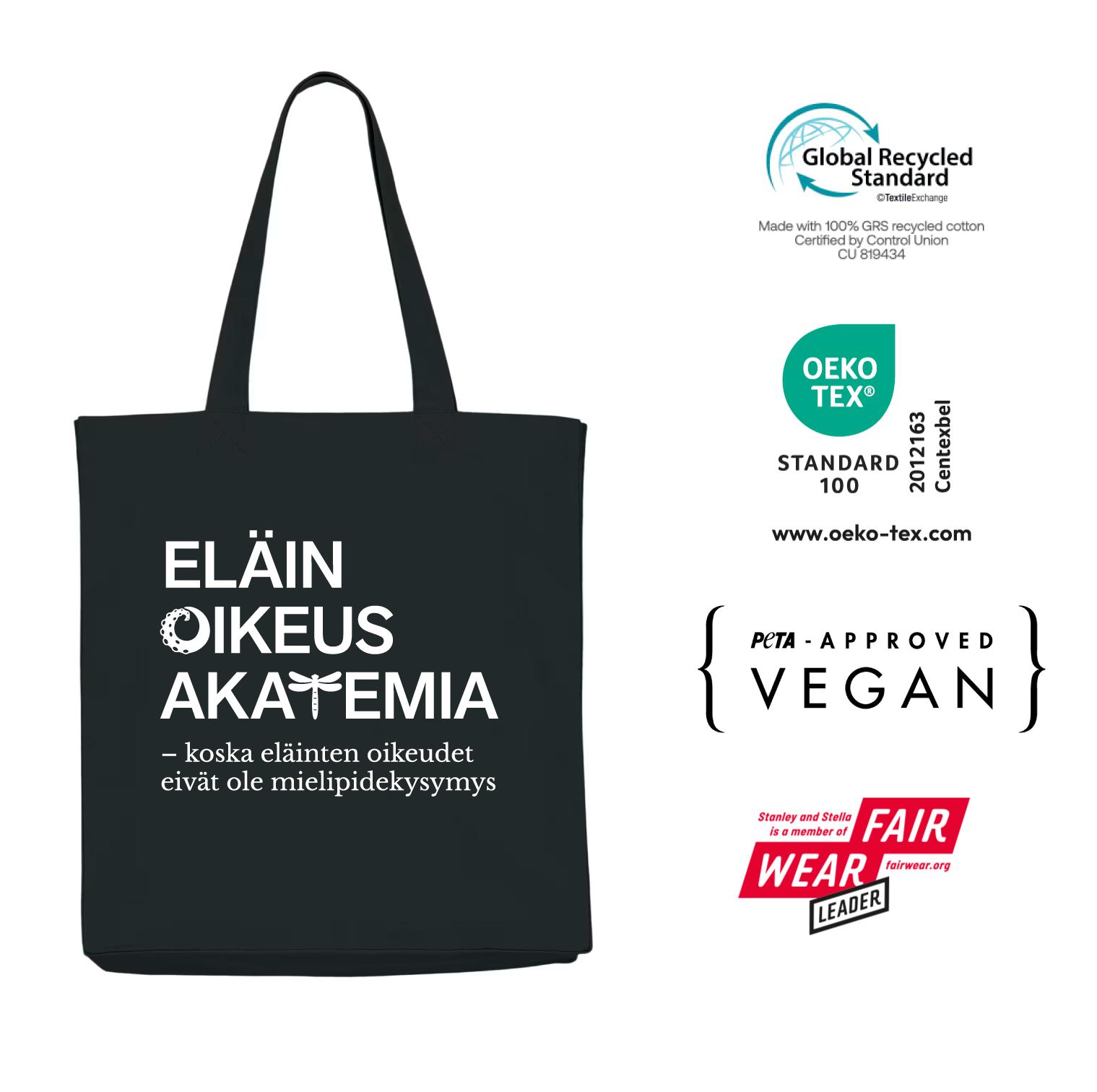 Eläinoikeusakatemian tyylikäs kassi on täydellinen arjen monitoimikassi. Kassi on valmistettu vahvasta, esipestystä kierrätyspuuvillakankaasta. Jos tarvitset hyvää kassia, tämä on kassiksi ekologinen valinta ja ostoksesi tuotot käytetään eläinoikeustyöhön.